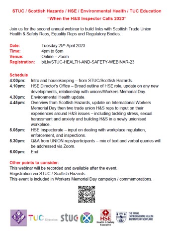 STUC, HSE, Environmental Health, TUC Education and Scottish Hazards present "When the Health and Safety Inspector calls”, the second annual webinar to build links with Scottish Trade Union Health & Safety Reps, Equality Reps and Regulatory Bodies.